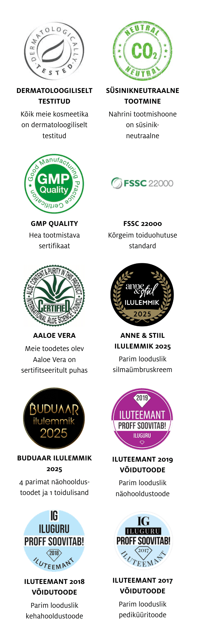 Nahrin kosmetika neturi alergenų ir tinka net jautriausiai odai. Mūsų kosmetikos gaminiai yra dermatologiškai patikrinti ir 2017, 2018, 2019 ir 2025 metais laimėjo geriausių natūralios kosmetikos gaminių Estijoje titulus.